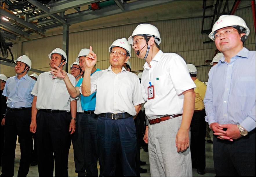 考察團(tuán)參觀了公司的前大梁機(jī)器人工作站、后下車(chē)體全自動(dòng)焊接線和沖壓全自動(dòng)線?,F(xiàn)代化的全自動(dòng)機(jī)器人流水線吸引了陳武主席和隨行的考察團(tuán)成員紛紛駐足,韋宏文董事長(zhǎng)介紹道:公司從2011年起推行智能工廠建設(shè),公司現(xiàn)共已投入自動(dòng)化生產(chǎn)線近60條,機(jī)器人近500臺(tái),五菱工業(yè)公司平均自動(dòng)化率已達(dá)31%。